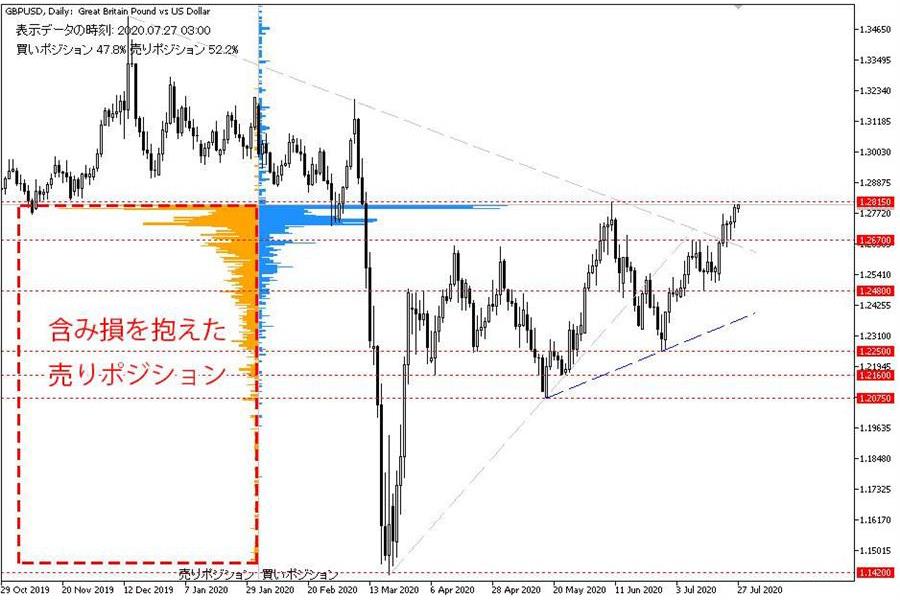 オープンポジションを見ると、どの水準に含み損を抱えたポジションが多いかを視覚的にチェックすることができ、次にどちらに動いた方が、価格の動きが大きくなりそうか(損切り注文が多く出そうか)を予想することができます。