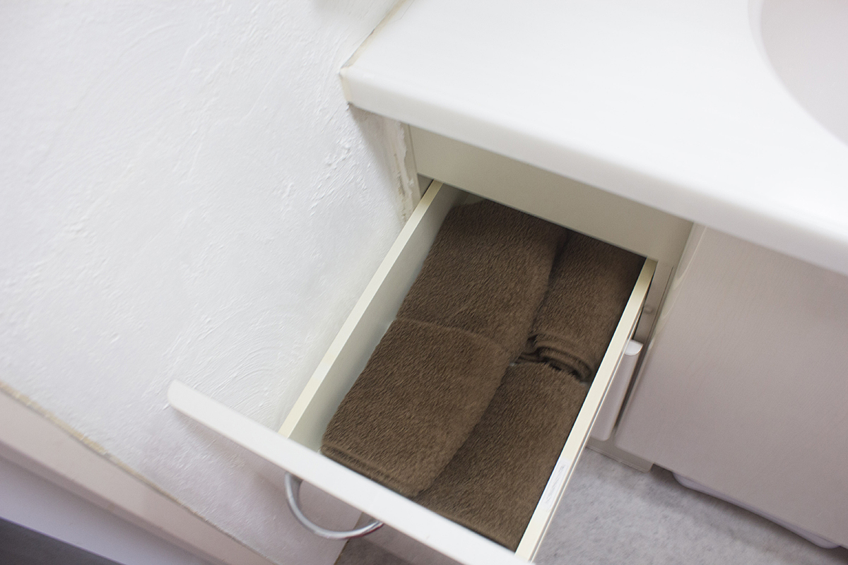 朝時間の効率化でタオル? と思われるかもしれませんが、洗面所の片づけで最初に取り組むべきは「タオル収納の見直し」です。タオルは必ず毎日使うものですし、使ったら洗濯、干す、畳む、戻す、と家事の量が増えるもと。さらに洗面所という狭い空間において、非常に多くのスペースを占めているモノなので、まず最初にタオルを見直すことで空間を確保したいのです。そこでぜひ、タオルの素材と枚数を確認する家族会議を行いましょう。