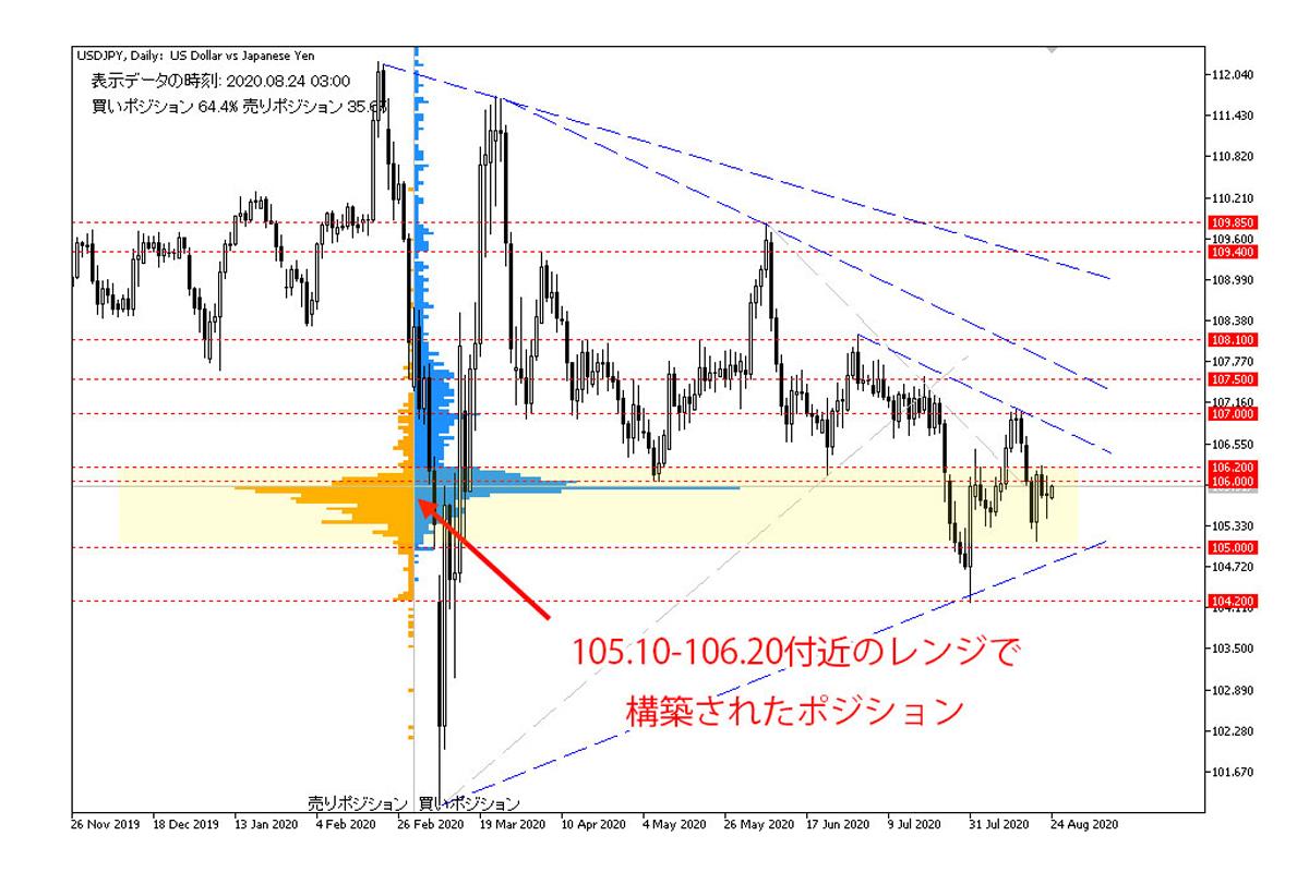 OANDAのオープンポジションを見ると、買いポジションの比率が引き続き6割を超える中、直近の価格レンジとなる1米ドル=105.10~106.20円付近のレンジで構築されたポジションが売買双方で多く、このレンジをしっかりと抜けるような動きとなると、苦しくなったいずれかのポジションの損切り注文(損失拡大を防ぐための決済注文)が増え、抜けた方に価格が勢いづく可能性が考えられそうです。