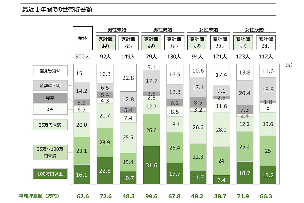 この結果をもう少し詳しく見ていきましょう。調査では、「世帯」としての最近1年間の貯蓄額(※2)を尋ねたため、未婚・既婚でそもそもの貯蓄額に差が出ることが予想されます。