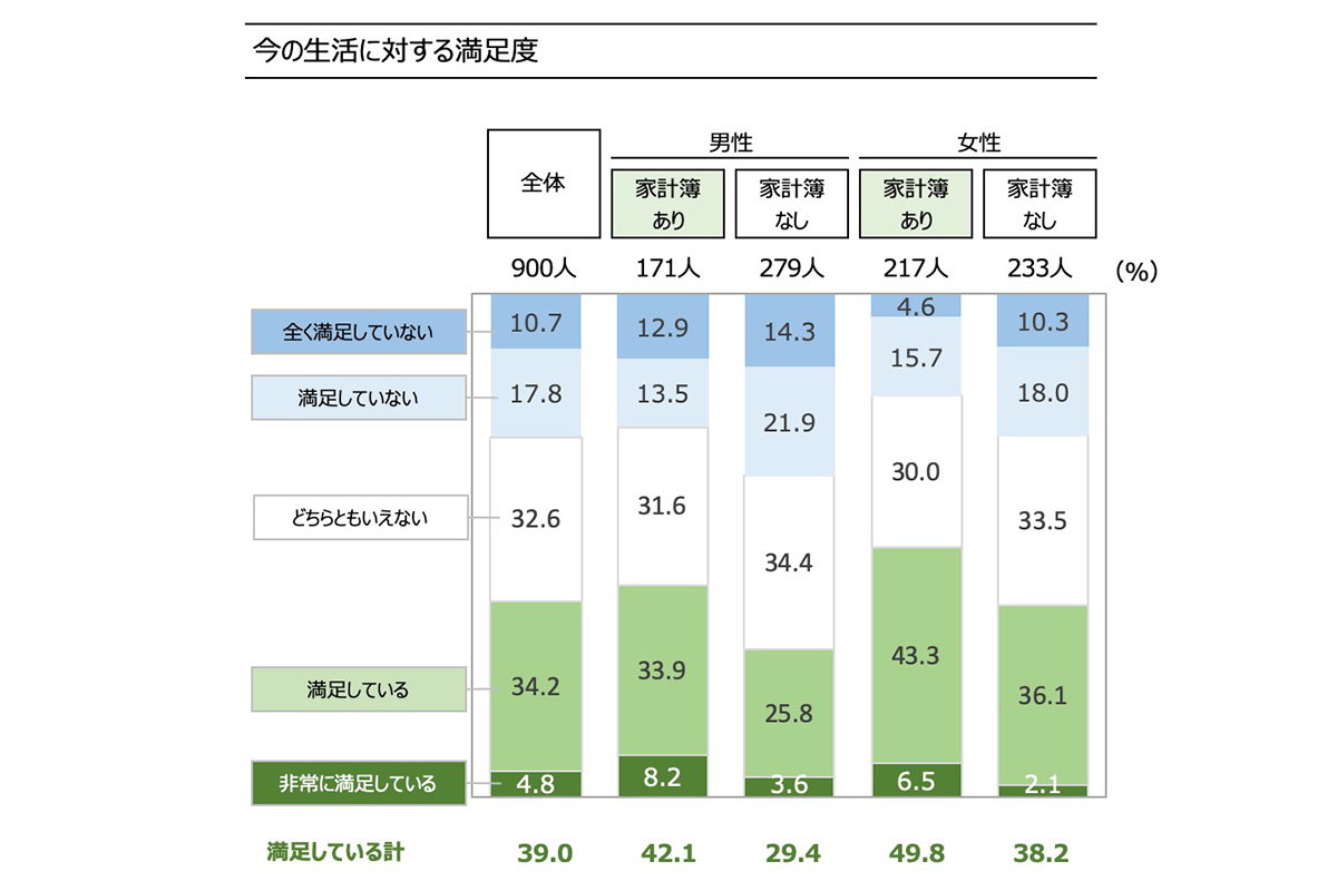 今年7月にアンケート調査(※1)を実施したところ、男女とも家計簿をつけている人は、つけていない人に比べて貯蓄額(世帯)が高めであることがわかりました。さらに、現在の生活に対する満足度も高いということも明らかになりました。