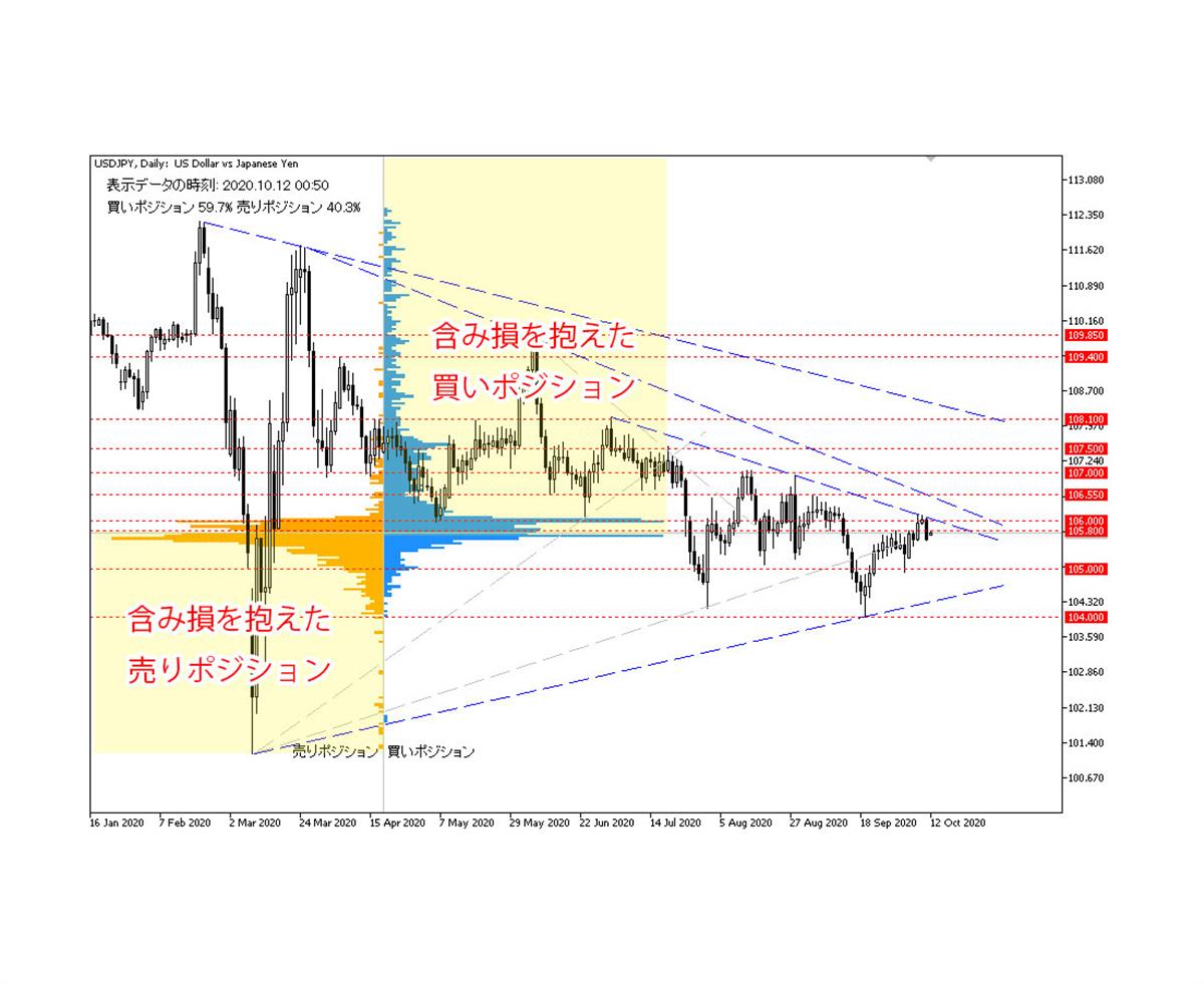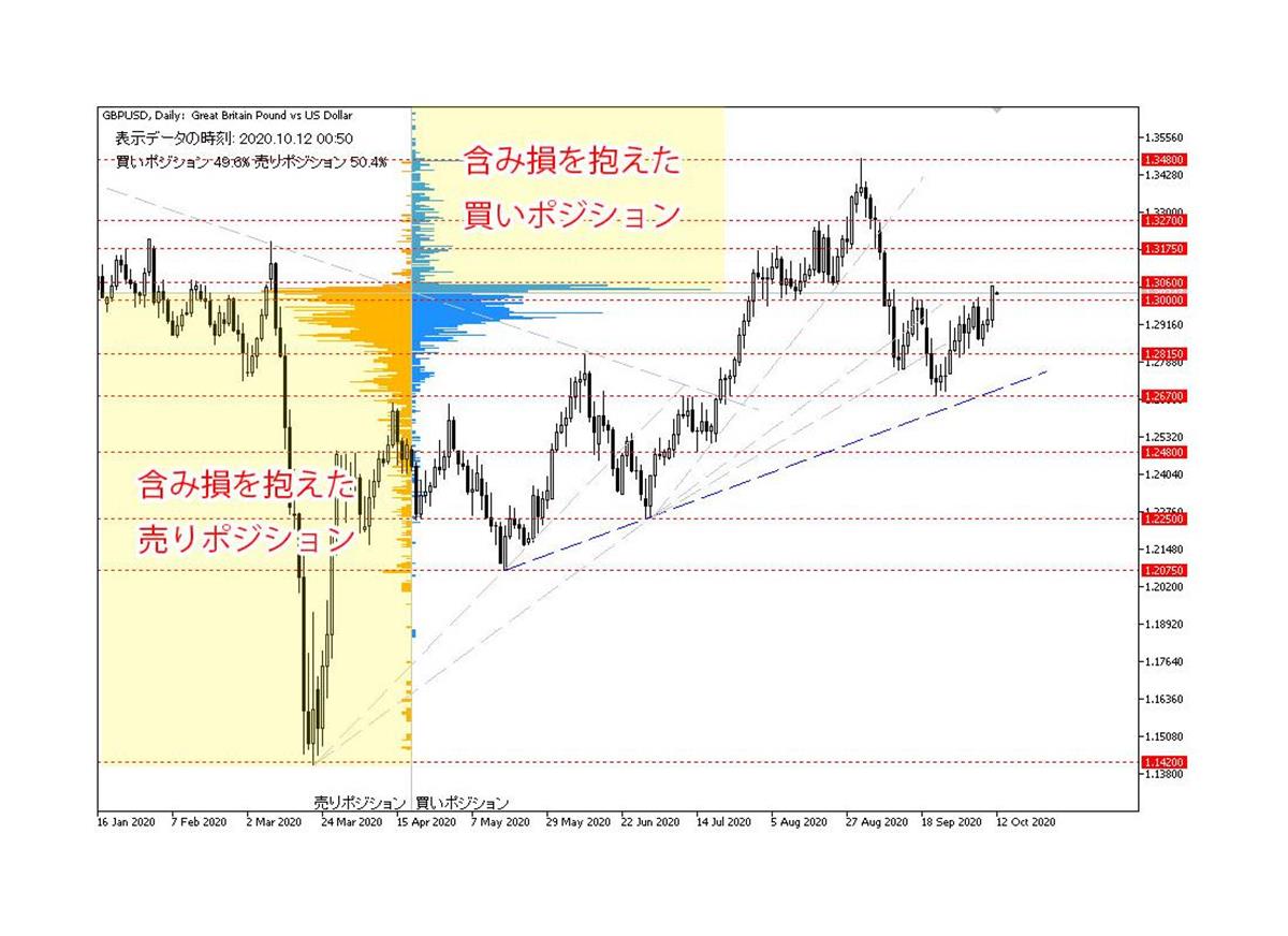 オープンポジションを見ると、どの水準に含み損を抱えたポジションが多いかを視覚的にチェックすることができ、次にどちらに動いた方が、価格の動きが大きくなりそうか(損切り注文が多く出そうか)を予想することができます。