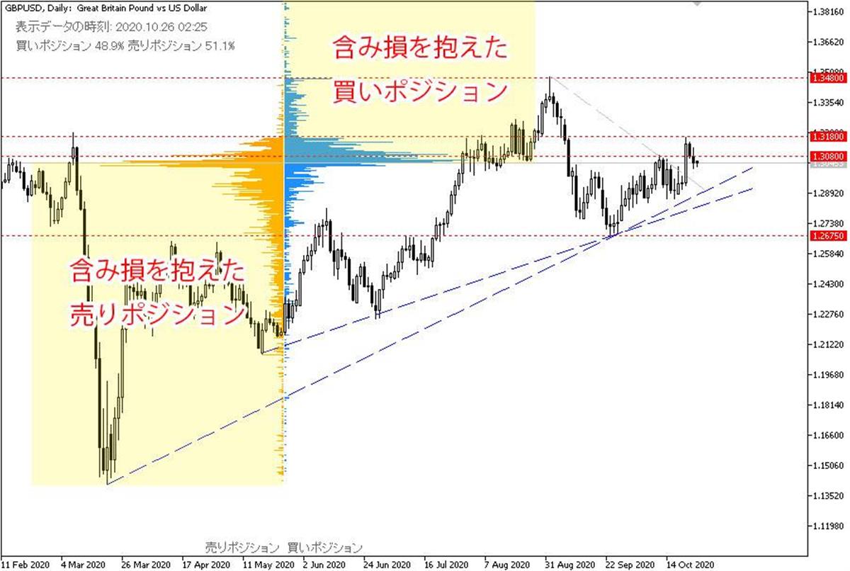 オープンポジションを見ると、どの水準に含み損を抱えたポジションが多いかを視覚的にチェックすることができ、次にどちらに動いた方が、価格の動きが大きくなりそうか(損切り注文が多く出そうか)を予想することができます。