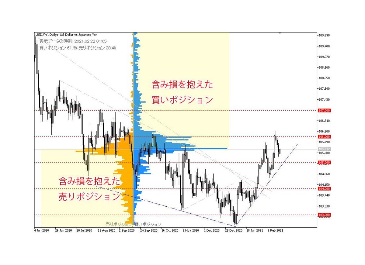 一方で、直近の下押しで含み損を抱えた買いポジションも少し増えており、上昇した水準ではこれらの利益確定売りが上値を圧迫、下押しが続くとこれらのポジションの損切りの売りが増え下落を後押しする可能性にも少し注意が必要となりそうです。
