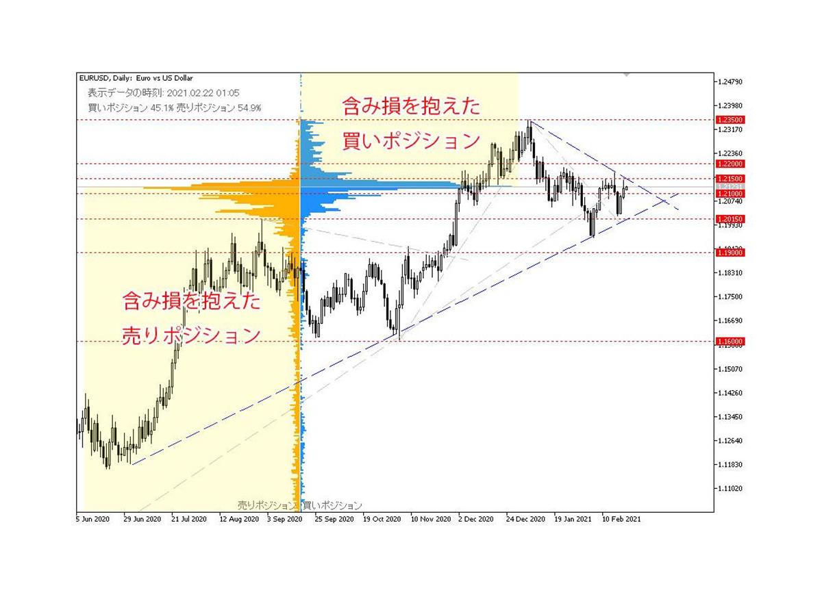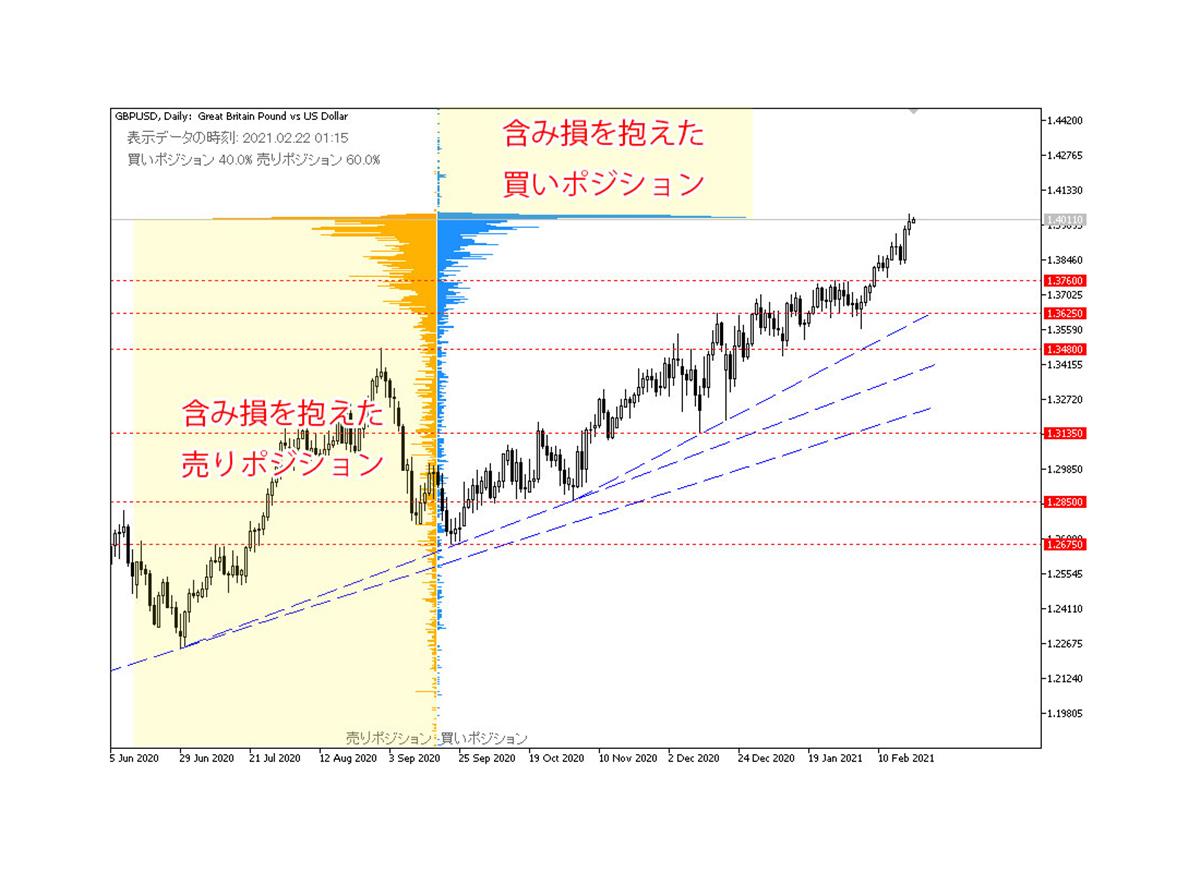 オープンポジションを見ると、どの水準に含み損を抱えたポジションが多いかを視覚的にチェックすることができ、次にどちらに動いた方が、価格の動きが大きくなりそうか(損切り注文が多く出そうか)を予想することができます。
