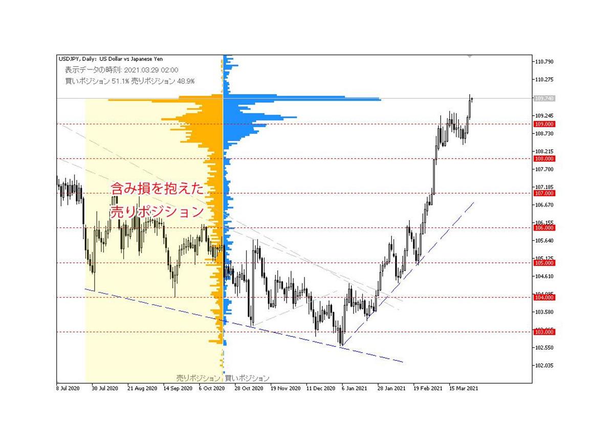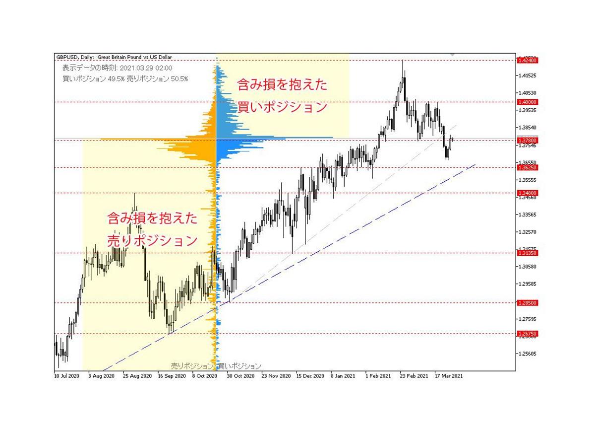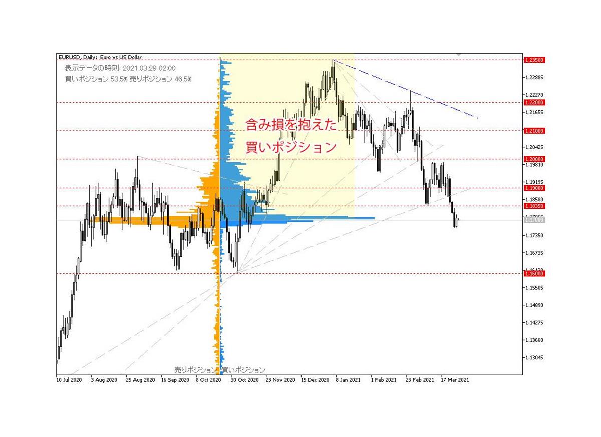 オープンポジションを見ると、どの水準に含み損を抱えたポジションが多いかを視覚的にチェックすることができ、次にどちらに動いた方が、価格の動きが大きくなりそうか(損切り注文が多く出そうか)を予想することができます。