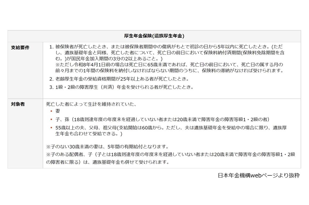保障を検討する際、まずは公的保障、次に勤務先の制度を活用し、それでも不足する分を自助努力でカバーというのが原則です。死亡保障の場合、公的保障というのは遺族年金です。公的年金は1階部分の「基礎年金」と2階部分の「厚生年金」から構成されていますが、それぞれ給付してもらえるための要件があります。