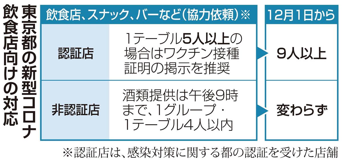 新型コロナウイルス感染者の減少を受け、東京都は25日、十分な感染防止対策を講じていると認証された飲食店について12月1日から、ワクチン接種証明の提示を求める人数を1テーブル「5人以上」から「9人以上」に緩和することを決めた。8人までの入店については、特に条件を設けない。政府の観光支援策「Go To トラベル」の再開に合わせ、都独自の補助事業も実施する。