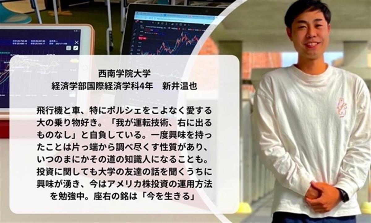 新井:今はアルバイトで稼いだお金を自由に資産運用してるけど、就職したら安全資産と危険資産に分けて投資を行なっていきたいね。感覚としては、危険資産を自分のポートフォリオの1/3程度で運用したいかな。けど、性格的にハイリスクハイリターンの資産運用の仕方をこれからもしていきそうだね。マインドとしてはこれからもBe positive!