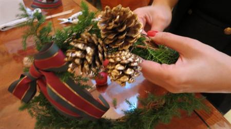 用意するものは、リースの土台1個、松ぼっくり3~5個、姫リンゴ5~7個、コットンフラワー4~6個、ヒムロ杉5~8本、シルバーモスを適量。それにリボンとワイヤ(20番か22番)も使います。樹脂を使った接着道具「グルーガン」もご用意ください。この花材なら約1カ月間は色が持ちますので、12月初めからクリスマスまで、華やかなままアレンジを飾って楽しむことができます。
