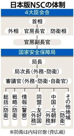 NSCは、外交・安全保障政策の迅速な意思決定と情報の一元化を図るため、首相と官房長官、外相、防衛相による「4大臣会合」を常設。2週間に1回程度開催し、緊急事態に対応するため、首相が指定した閣僚で構成する「緊急事態大臣会合」も新設する。