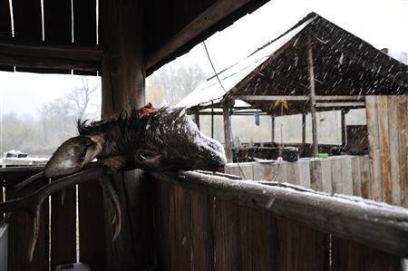 小屋のテラスには昨日までなかったアカシカの頭が逆さに置かれていた。昨夜ベテラン猟師のトーリャが獲ってきたのだ。