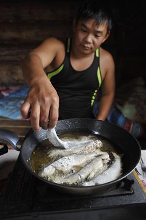ハリウスは長い背びれと虹色のうろこが美しく、白身のおいしい魚だ。うれしいのは僕ばかりではない。魚を岸に上げると、すかさず猫が飛びかかってきた。朝から猫まで釣ってしまうとは。やがて猟師のアンドリューシャが起きてタバコを一服すると、同じように竿を手に川岸に立った。黒猫が足元に座り川面を眺める。彼もあっという間に次々と魚を釣り、猫はまんまとお代わりを手にしたのだった。この何気ない狩小屋の日常こそが、かけがえのないタイガの魅力だと思う。