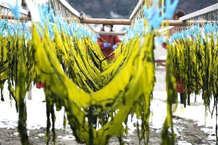 干したワカメは夕方、取り込み、ゴザにくるんで小屋にしまっておくという。雨に降られて濡れたり、強風で砂まみれになったりすると困るからだ。翌日また干し直し、かりかりに黒い干しワカメになるには、けっこう手間がかかる。
