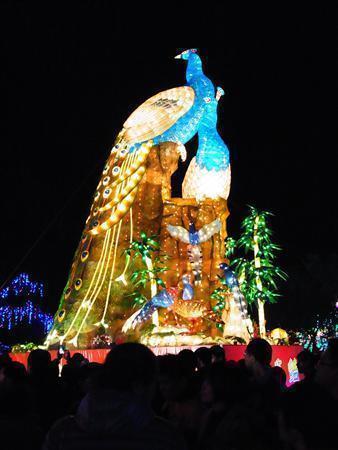 今年で25回目を迎えた「台湾ランタンフェスティバル」のメーン会場に登場した巨大電飾馬は、古代中国の名馬「焉耆馬(えんぎば)」が台湾の最高峰「玉山」(3952メートル)の山頂に駆け上がる姿をイメージしたもので、高さ23メートル、重さ約30トンもある。ハイテクで制御された20万個以上のLED電球が、30分ごとのパターンで色とりどりの光を放ち、訪れた家族連れやカップルらを魅了した。このほか、クジャクや台湾固有種のヤマムスメ、サンケイなどの鳥をデザインした大型ランタンがお目見えし、観光客らの人気を集めていた。