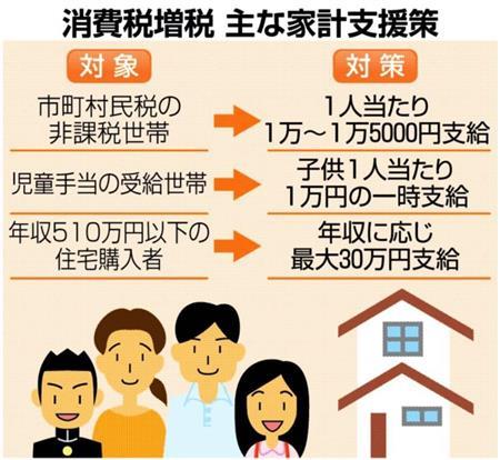 家計支援策は主に、低所得者が対象の臨時福祉給付金▽子育て世帯臨時特例給付金▽住宅購入者が対象のすまい給付金-がある。