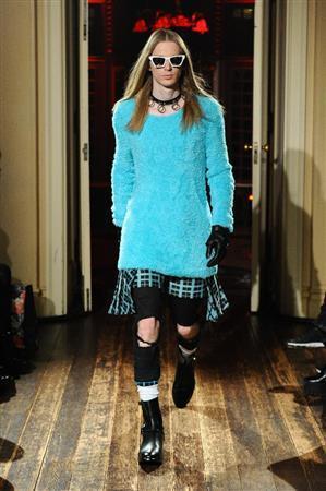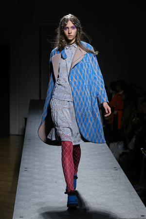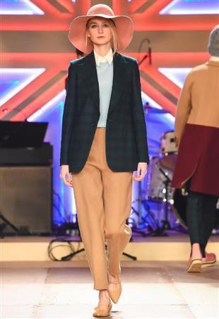 「ビューティフル ピープル」は、ステージの中央に大きなユニオンジャックのイルミネーションが据えられ、披露されたのはまさに60~70年代の英国調の装い。デザイナーの熊切秀典氏らがビートルズの人気曲を演奏する中、色もパターンもさまざまなチェックが見られたが、中でも、ゆったりしたシルエットのパンツに、オーソドックスなグリーンのチェックのジャケットを重ねたスタイルが印象に残った。