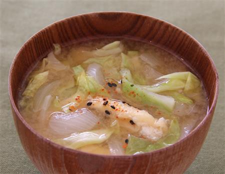 〔1〕だし汁を温め、キャベツ、新玉ねぎ、油揚げを加える。煮えたら、みそを溶き入れる。
