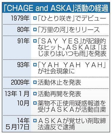 ASKA容疑者は福岡県出身。同級生だったChageさんと「チャゲ&飛鳥」(当時)を結成し、1979年にデビュー。91年に「SAY YES」、93年には「YAH YAH YAH」と200万枚を超えるヒット曲を連発。ソロ活動や作詞・作曲家としても才能を発揮した。