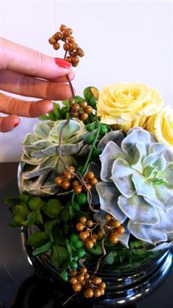 今回、プリザーブドフラワーと、オブジェのようにユニークな姿のベンケイソウ科の多肉植物を組み合わせてみました。多肉植物もまた日持ちがよいことで知られます。バラとアジサイと多肉植物、それぞれの質感がさまざまな異素材ミックスの、面白いアレンジメントとなりました。多肉植物には緑色の花材用テープを巻いた木の棒を根元に挿し、こんもりとしたアジサイの上に載せるように活けます。多肉植物2株、そしてバラ3輪も、高低差をつけて、アレンジ全体に立体感がでるようにバランスを考えて活けてください。最後に丸い実物やアートのグリーンボールなどを足し、アレンジにリズムをプラスしても面白いですね。