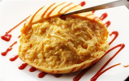 卵3個を使った「ふわとろオムライス」(700円)。客の眼前で包丁を入れると卵がとろけ出す=2014年5月12日、京都市中京区(恵守乾撮影)