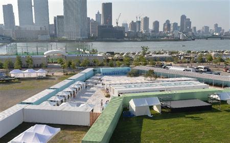 6月16日にオープンする複合施設「MAGIC_BEACH(マジック・ビーチ)」の全景。先行内覧会では、水着ファッションショーやファイアダンスなどのイベントが行われた=2014年6月15日午後、東京都江東区(栗橋隆悦撮影) 「スポーツ、アウトドア、イベント」をキーワードに、東京・豊洲に6月16日オープンする複合施設「MAGICBEACH(マジック・ビーチ)」の先行内覧会が15日行われ、関係者約200人が出席した。