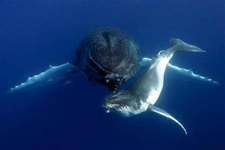 海面で息継ぎをするため浮上した子クジラは、ひとしきり海面で遊ぶと、海中に留まり、身体を休める母親の元に戻って来る=2010年9月14日、トンガ・ババウ諸島(越智隆治さん撮影) 目の前、水深5メートルほどのところに、ザトウクジラの母子が、じっと動かずに留まって身体を休めている。子クジラは、水面まで浮上してきて、ひとしきり遊んだかと思うと、またゆっくりと潜降して、静かに胸びれを動かす母クジラのおなかの下に隠れるように潜り込んだ。しばらくすると、こちらの様子を伺うように、おなかの下から顔をのぞかせた。そのしぐさに、思わずマスクの中の顔がほころんだ。