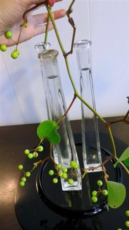 涼感を出すポイントは、つる植物の特徴を生かして、花瓶から下へとシャワー状に、流れを生み出すように草花をいけることです。そのため、今回メーンで使う花瓶には、丈がある、細口のガラス瓶3本を選びました。サンキライとベルテッセンのダイナミックな流れを生かすため、花瓶は最低でも20センチ、25~40センチぐらいの高さが欲しいところです。口の直径も、できるだけ細い方が花材がきっちり止まるうえ、アレンジ全体が締まって見えて素敵です。