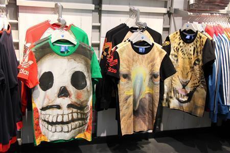 W杯の舞台となっているブラジルのファッションブランド「ザ・ファーム・カンパニー」とのコラボレーションしたウェアのコーナー。鮮やかな色彩で描かれた4種類のプリント柄が中心=2014年5月28日、東京都新宿区の「アディダス_ブランドコアストア新宿」(田中幸美撮影)