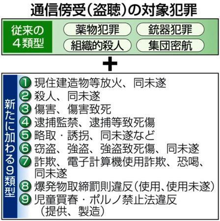 一つは、電話や電子メールを通信傍受(盗聴)できる対象に、組織性が疑われる詐欺や窃盗など9類型の犯罪が追加されます。もう一つは司法取引で、共犯者など他人の犯罪の解明に協力する見返りに起訴されないなどの利益を受けることが可能になります。これは経済事件や銃器・薬物事件に限定されています。
