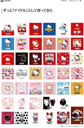 アイドルの写真をざっと時代順に眺めると、大衆文化や流行の移り変わりがよくわかる。実は、キティちゃんもそう。「キティをアイドルとして育てたい。ずっとそう思ってやってきました」と山口さんは、巧みに流行を取り入れ、キティちゃんのおしゃれに気を使ってきた。