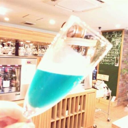 珍しい青色のスパークリングワイン「ラ・ヴァーグ・ブルー・スパークリング」=2014年7月17日(竹内香奈子さん提供) 夏本番ですね! 今月(7月)紹介するのは、珍しい青色のスパークリングワイン「ラ・ヴァーグ・ブルー・スパークリング」。まるで海の中にいるようなきれいなコバルトブルーで、見ているだけでも涼しさを感じます。飲んでみるとシュワシュワとした泡がノドを刺激し、さらに爽快感がアップします。