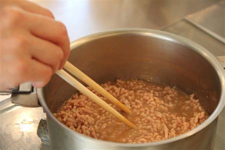 〔1〕鍋にだし汁、しょうゆ、みりんを入れて中火にかけ、沸騰したらひき肉を加え、菜箸(さいばし)でポロポロに煮ほぐす。