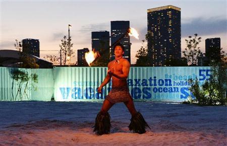 6月16日にオープンする複合施設「MAGIC_BEACH(マジック・ビーチ)」の全景。先行内覧会では、水着ファッションショーやファイアダンスなどのイベントが行われた=2014年6月15日午後、東京都江東区(栗橋隆悦撮影) この6月、東京・豊洲の街中に突如として真っ白いビーチが出現したのをご存じだろうか。ベトナムから550トンの砂を持ち込んだ「THE BEACH 55(ザ・ビーチ55)」というカフェだ。産経新聞社が手がける遊休地利用事業の一環で、複合施設「MAGIC BEACH(マジック・ビーチ)」の一角に作られた。