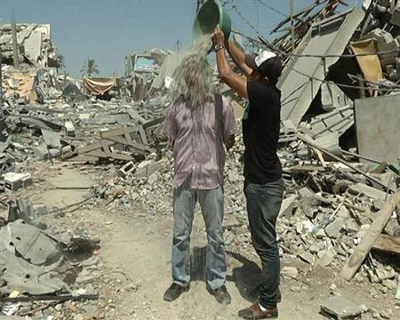 パレスチナ自治区ガザ地区で、氷水ではなく、がれきをかぶるジャーナリストのアイマン・アルール氏=2014年8月22日、イスラエル(本人提供・共同) 世界的に大ブームとなっている氷水を頭からかぶり難病患者支援の輪を広げる「アイス・バケツ・チャレンジ」が、形を変えて広がりをみせている。イスラエル軍の空爆が続くパレスチナ自治区のガザでは、現地のジャーナリストらが世界に惨状を訴えるため、がれきを頭からかぶる映像を公開。インドでは、バケツ1杯のコメをかぶるのではなく、貧しい人々に寄付しようと呼びかける運動が起きた。新たな運動には、多数の有名人がパフォーマンスを繰り広げ、「セレブのお遊び」との声もある氷水かぶりに対する“皮肉”も込められている。