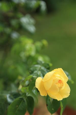 芝の緑をバックに、(1)は曇っていましたが、太陽がカメラの後ろ側にある順光で、(2)は逆光で撮影しています。同じ花でもまったく印象が違いますね。(2)の方がバラらしい、何枚にも重なり合った花びらの柔らかさが出ていると思います。