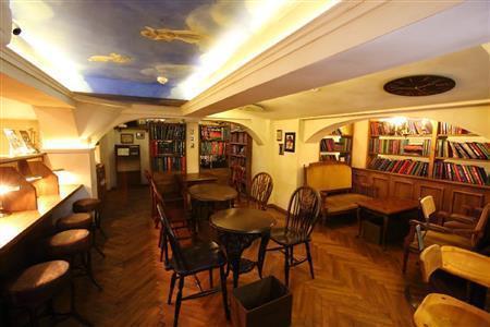 壁の本棚を埋め尽くす年代物の洋書の数々や、重厚感漂う使い込まれた印象のいすやテーブルは古き良き米国スタイルを踏襲した=2014年8月29日、京都市東山区(恵守乾撮影)