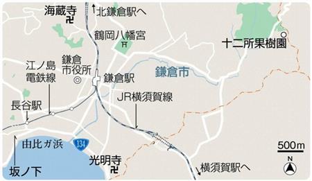 9日はあいにくの薄曇りだったが、その分、幻想的でもある。手前は海、そして、材木座の名刹(めいさつ)、光明寺本堂の大屋根も心なしか小さく見えるスーパーぶりをごらんいただきたい。