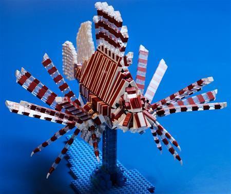 代表作の一つの「ミノカサゴ」。放射状に広がるヒレの付け根には、人形に持たせる小道具のデッキブラシを使った。「ふと目に入った。もしかしてと試したらピッタリくっついて、鳥肌ものでした」。専用のパーツという固定観念は捨てる。「こういう形をした部品という見方をします」。柔軟な部品選びが、造形の幅を広げる。