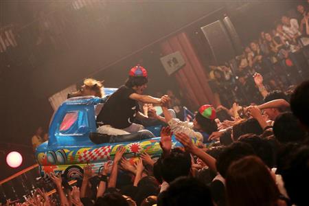 各バンドが「夙」「木」「窮」と書かれたのぼり旗を携えて登場し、正面の大ステージに陣取ったN’夙川BOYSの演奏からスタート。The Mirrasの畠山承平(Vo/G)は諸葛孔明の衣装を用意したほどの気合いの入れよう。順に1曲ずつ演奏する間、他のバンドはそれを見て踊るなど和やかな雰囲気だ。