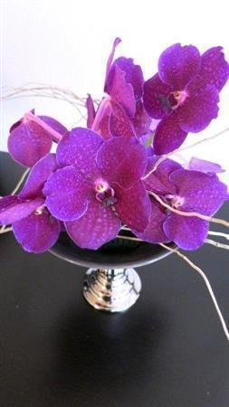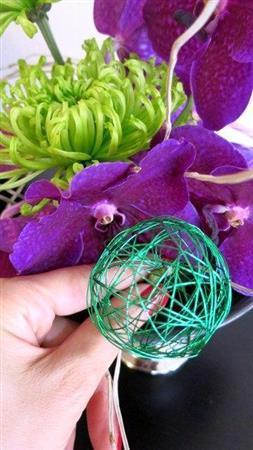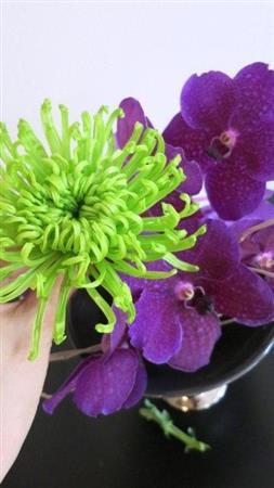 日本の菊がオランダで改良されてできあがったのがシャムロック。おしゃれなニュアンスがあるので、バラなどと合わせてブライダルブーケにもよく使われます。今回は紫色のラン「バンダ」と組み合わせて、ランの根っこやメタリックグリーンのワイヤでできた、異素材の球体オブジェなどを加えて菊をモダンな見せ方で活けています。
