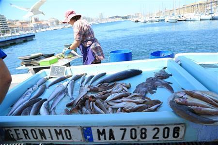 視点を変えてさまざまな角度から撮りましょう。魚の上にはパラソルがあり、日陰ができているので、露出がずいぶん変わります。背景が白く飛びすぎないよう注意して補正しながら撮りましょう。