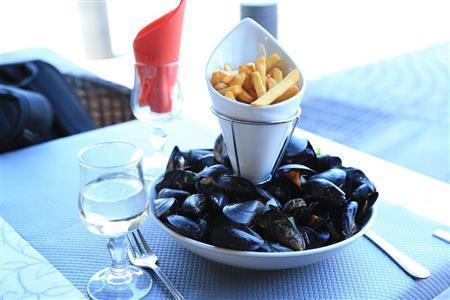 食べ物は縦に撮る方が奥行きも出てバランスの良い写真が撮れることが多いです。一番見せたいムール貝にピント、あとのポテトや白ワインはボケても分かりますので、ピントをわざわざ合わせなくてもいいですね。ピントを浅目にすることで見る人の注意をムール貝に集中させることができます。お皿の大きさや量が見た目よりも多く見えるようなカットの方が好ましいですね。