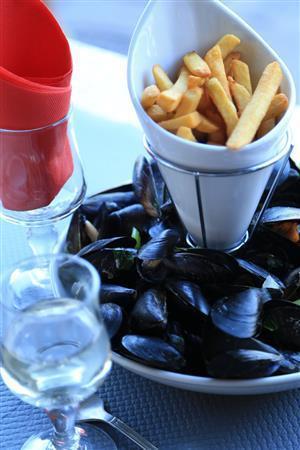 マルセイユに来たら魚介料理を写したいですね。ムール貝とワインの写真です。右のように全体を入れるとお皿やワイングラスが小さく感じられてしまいますね。