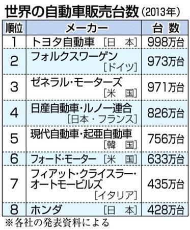 だが、13年のグループ世界販売が約998万台に達するトヨタ自動車や、2位のドイツのフォルクスワーゲン(VW、約973万台)は1000万台超えを視野に入れ、FCA、フォードにとって世界トップの背中は遠い。