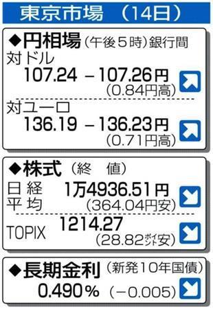 外為市場も大きく動いた。14日の東京外為市場は、約1カ月ぶりの円高ドル安水準となる1ドル=107円台前半で推移。日本時間14日夜の欧州の外為市場では、1ドル=106円台後半まで円が買われた。円相場は今月1日に1ドル=110円台をつけてから、わずか2週間で3円超買い戻された形だ。