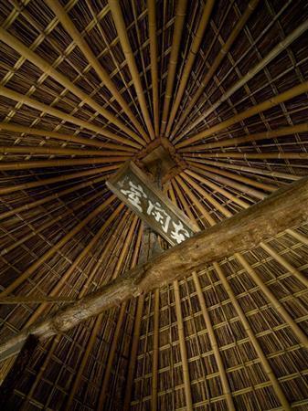 中に入ると、竹と丸木が放射状に組まれた構造が面白く、竪穴式住居みたいでホッとする。茶室の緊張感はなく、解放感や温かさに包まれる。一畳の上段があり、後藤典生住職のお話によれば、そこに秀吉が座っていたそうだ。金襴豪華で派手好きなイメージのある秀吉が、一方でこのように素朴で質素な場所を楽しんでいたかと思うと、思わず笑みがこぼれる。
