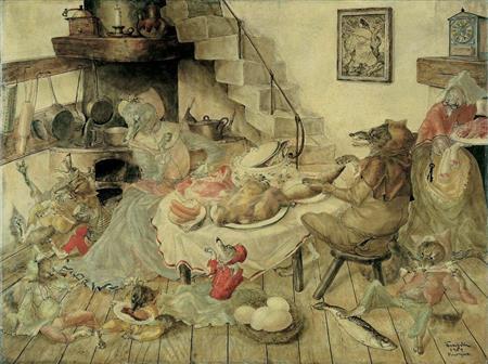 晩年に描いた作品は、「ラ・フォンテーヌ頌」(49年)など寓話に関する作品や、「シレーヌ」など神話による作品、ノートルダム・ド・ラ・ペ礼拝堂の壁画をはじめとする宗教画、そして少女、幼児たちの絵。「グロテスク」は、ボスやブリューゲルのように、人の醜い罪を描き表した、広い意味での宗教画を思わせる。