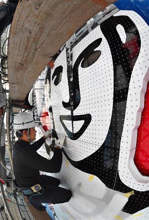 6代目の取り付けは9月下旬から始まり10月1日には顔のパーツが到着。慣れない高所、狭い足場で緊張する中、慎重に取り付けられていく6代目の顔を撮影した。