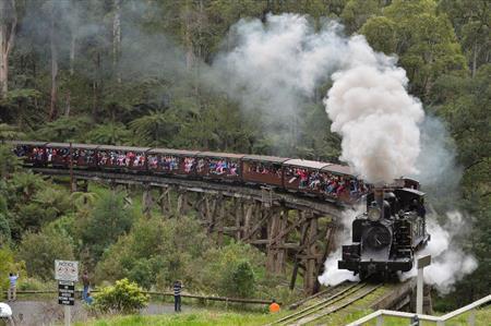 メルボルンの東約40キロに位置するベルグレーブ駅を出発し約25キロの道のりを走り抜ける。列車の窓にはガラスはなく、乗客は窓枠に腰掛け外に足を出したまま乗るのが人気だ。最大の見どころは全長85メートル、高さ12.8メートルの木製トレイスル橋。森を抜け橋にさしかかると乗客たちは歓声を上げていた。(写真・文:写真報道局 三尾郁恵/SANKEI EXPRESS)